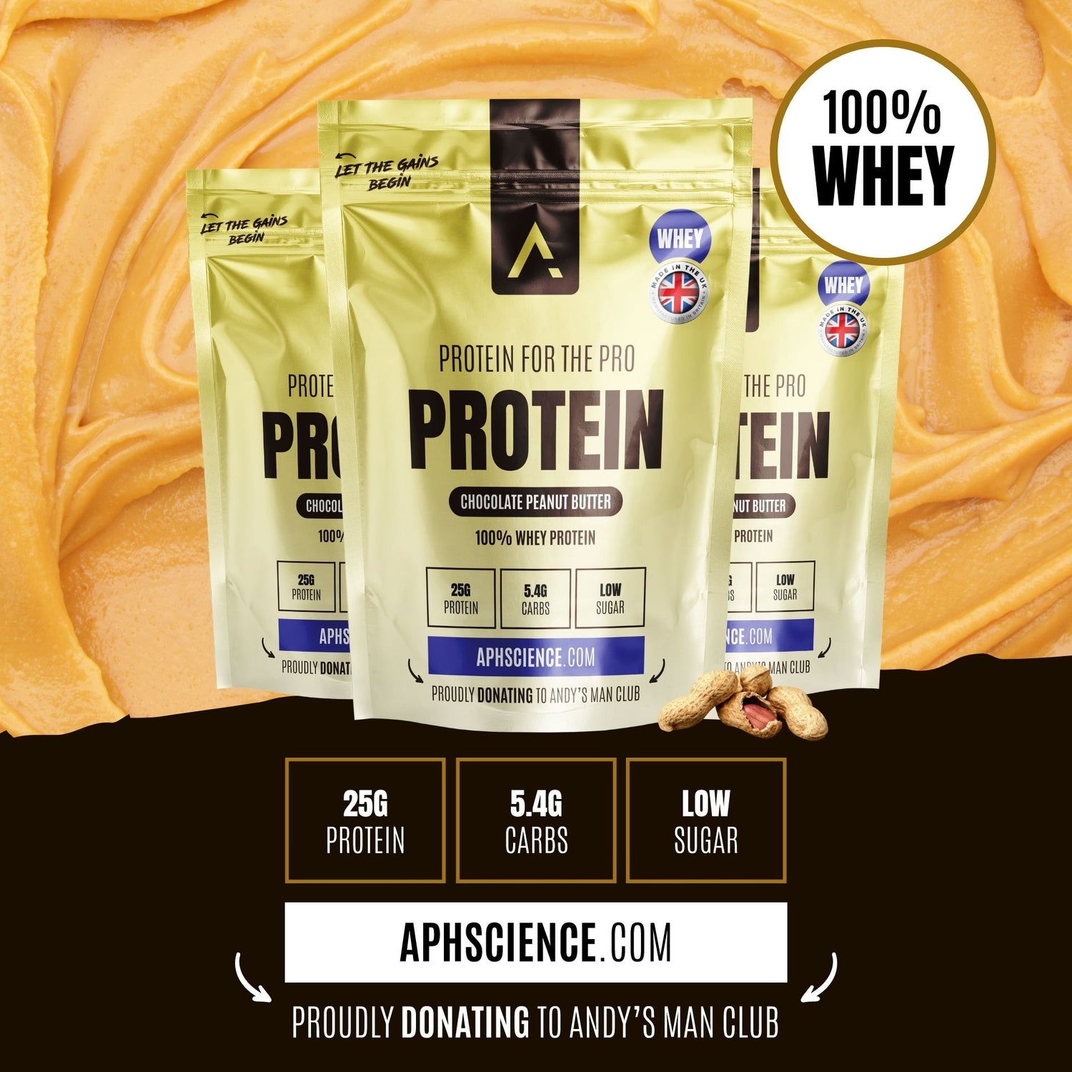 Increase your strength through optimal protein intake. APH Science 100% Whey Protein has 25g Whey Protein + 5.4g Carbs and Low Sugar (5.6g) per serving (36g). Mixes well so you could easily put 3x scoops in one shake for maximum gains!